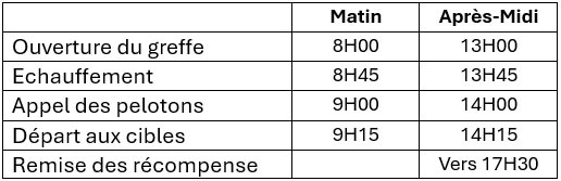 | Nom | Prénom | Club | arme | catage | 1er manche | Départ M1 | Repas M1 | 2ème manche | Départ M2 | Repas M2 | 3ème manche | Départ M3 | Repas M3 |